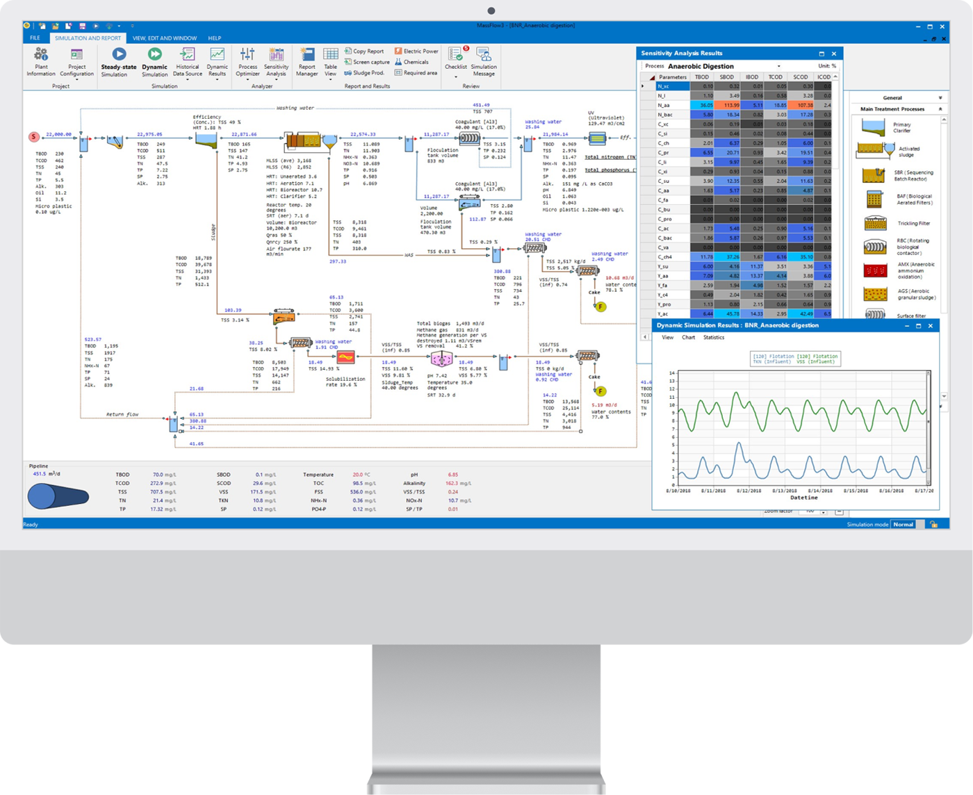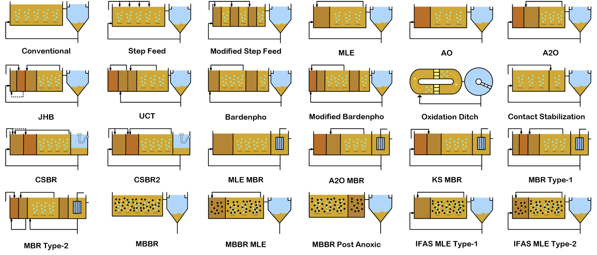 - 표준활성슬러지, A2O, MLE, Bardenpho, 산화구, MBR, MBBR, IFAS 등 조합 가능한 수십 종류의 활성슬러지 공정