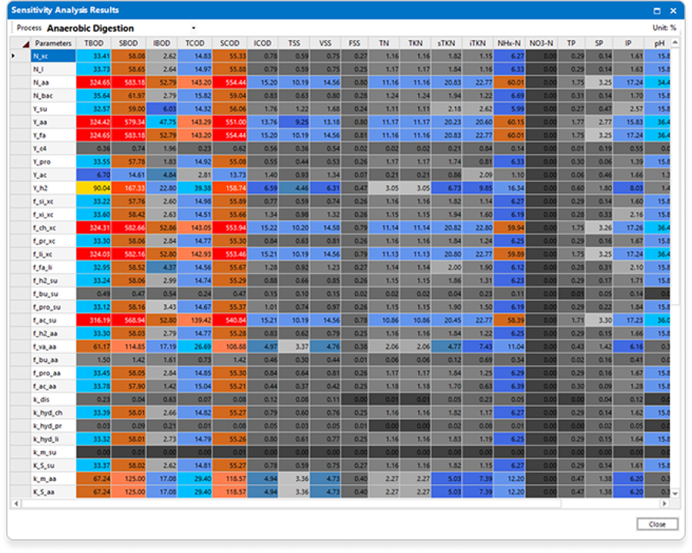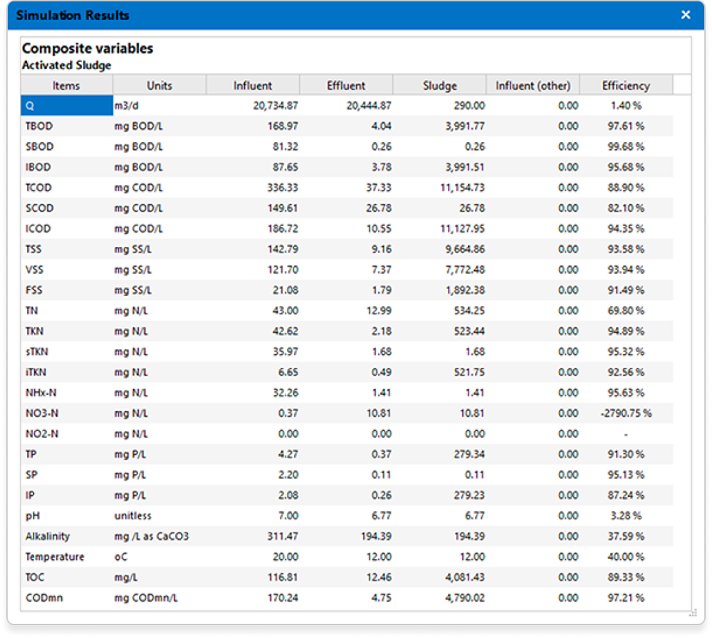 - 유기물질 : BOD, IBOD, SBOD, COD, SCOD, ICOD, TOC, TSS, VSS, FSS, CODmn, 5가지 사용자 정의 물질(용존물질 3개, 입자성물질 2개)