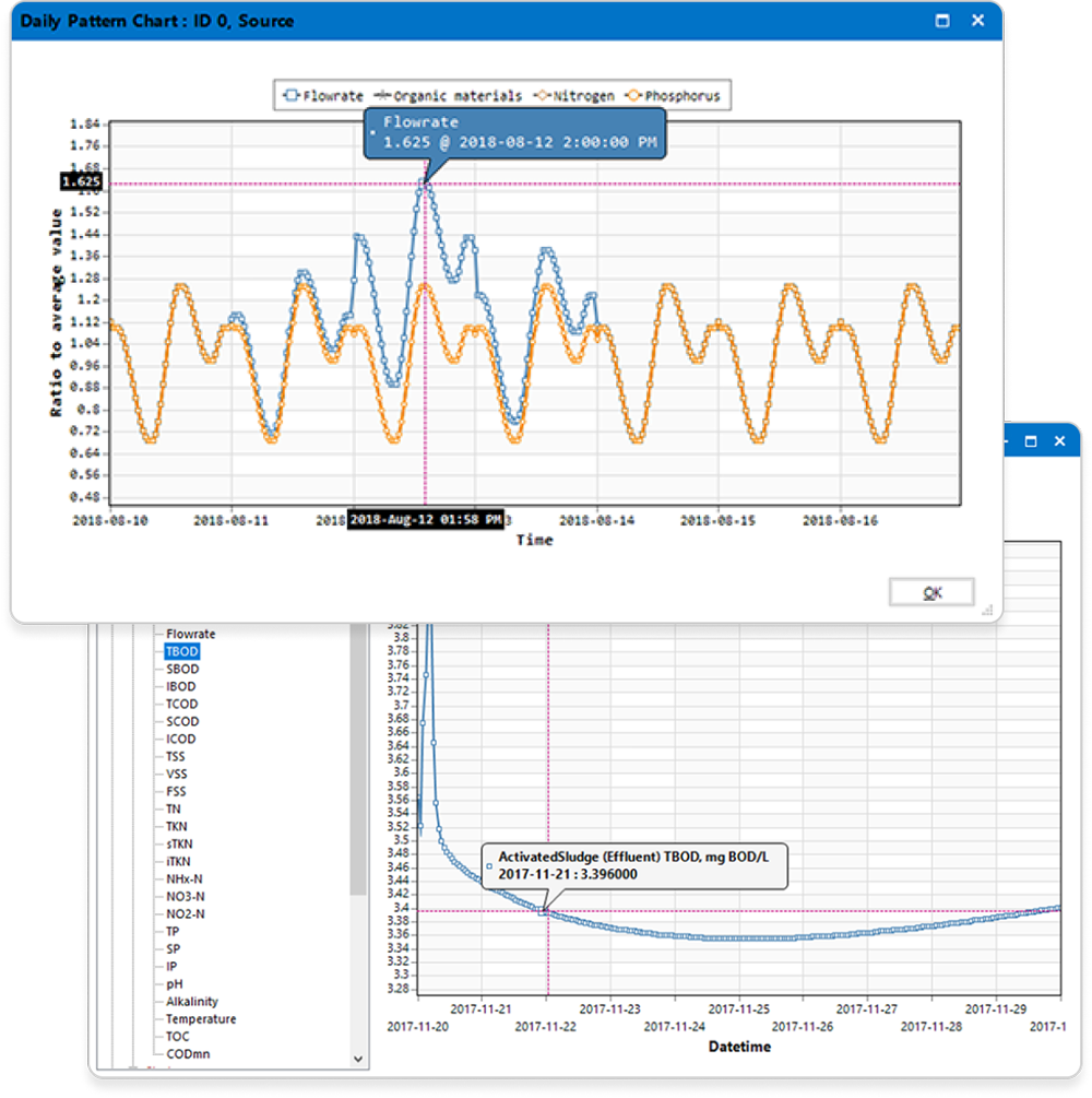 - 고부하, 저부하, 고유량 등 동적시뮬레이션을 위한 유입 하수 패턴 프리셋 제공