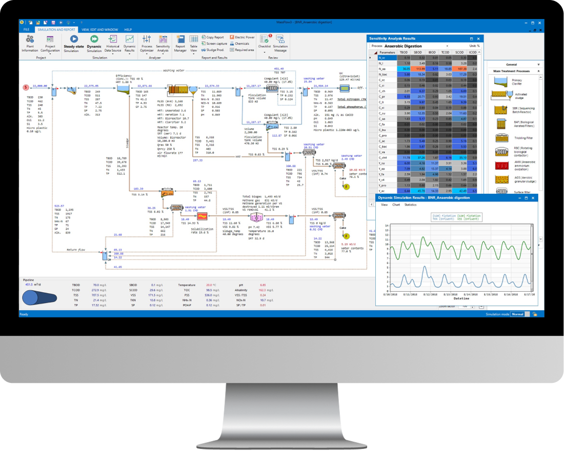 MassFlow는 IWA ASM No.2d 및 ADM No.1 기반의 하폐수 처리시설 공정 시뮬레이션을 위한 데스크탑 시뮬레이션 소프트웨어 입니다. 현장에서 수집되는 계측자료와 실험실 운영자료를 활용하여 전체 수처리시설에 대한 플랜트 와이드 시뮬레이션을 수행할 수 있습니다.