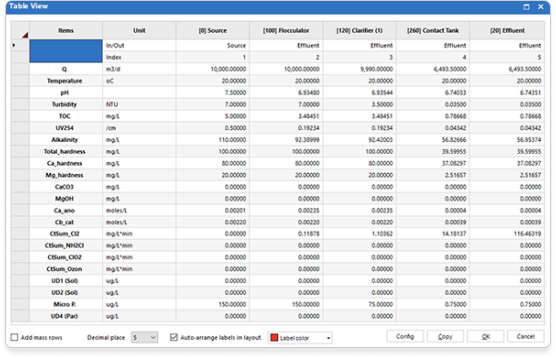 - 소독제 주입에 따른 잔류 소독제 농도, 소독능(Ct), 불활성화율(Inactivation), 소독부산물(DBPs) 시뮬레이션