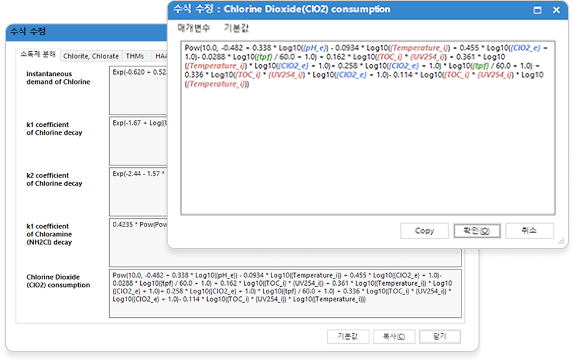 정수처리 공정 시뮬레이션에 사용되는 다양한 수식을