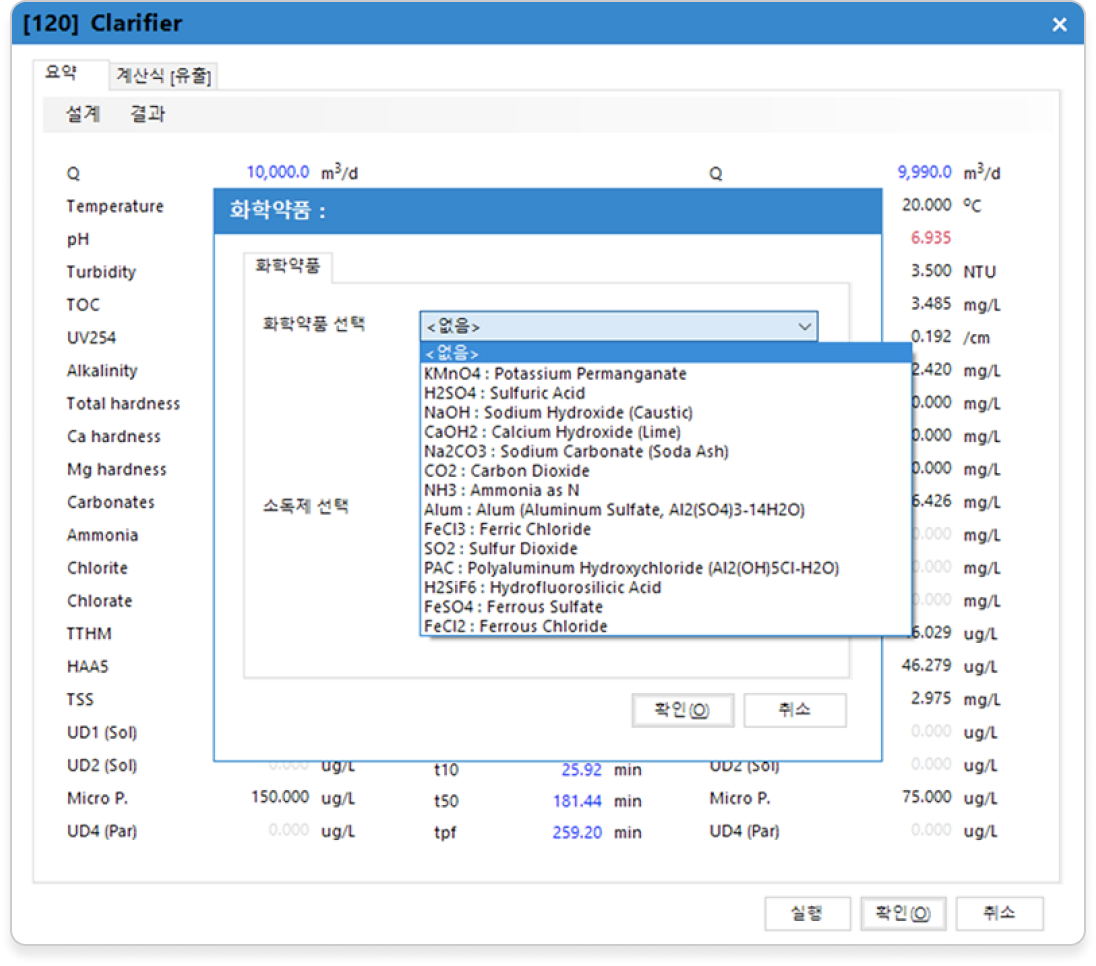 정수처리시설에서 다양한 화햑약품 및 소독제 주입량 분석 기능을 제공합니다. 정수처리시설 설계 운영 시 화학약품 및 소독제 주입량을 최적화 할 수 있습니다.