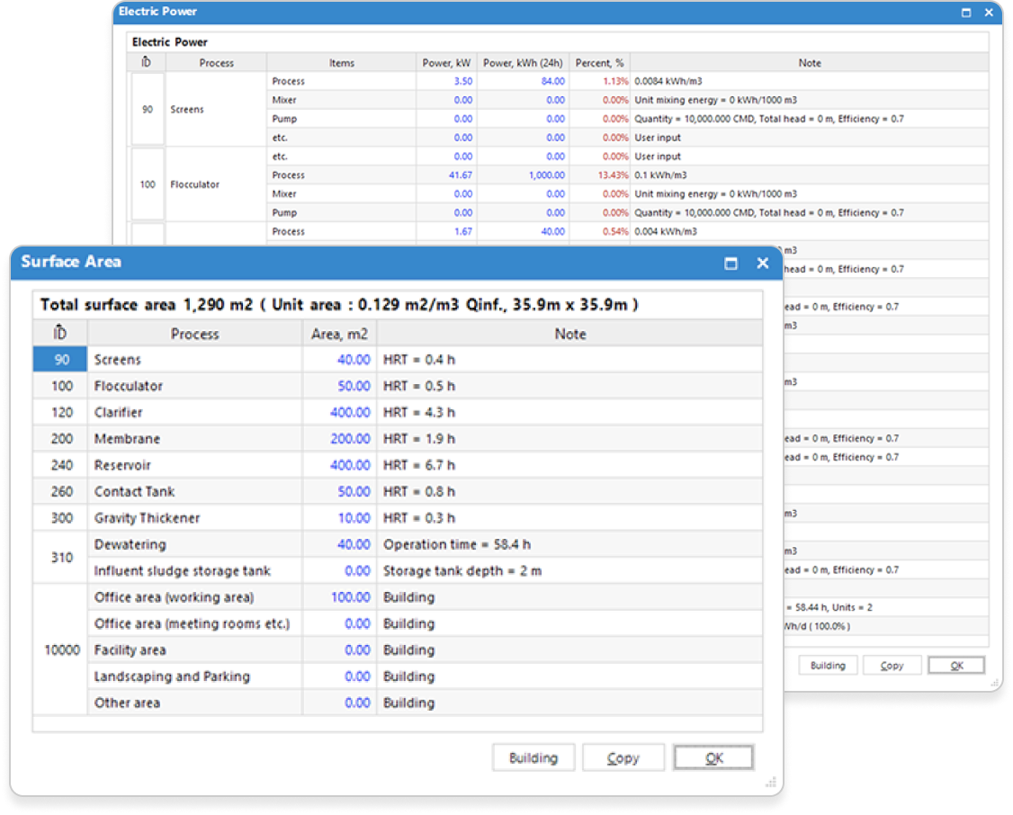 - 교반기, 펌프 등 주요 기자재 부하 및 전력량을 반응조 용량 및 유량과 연동 산출