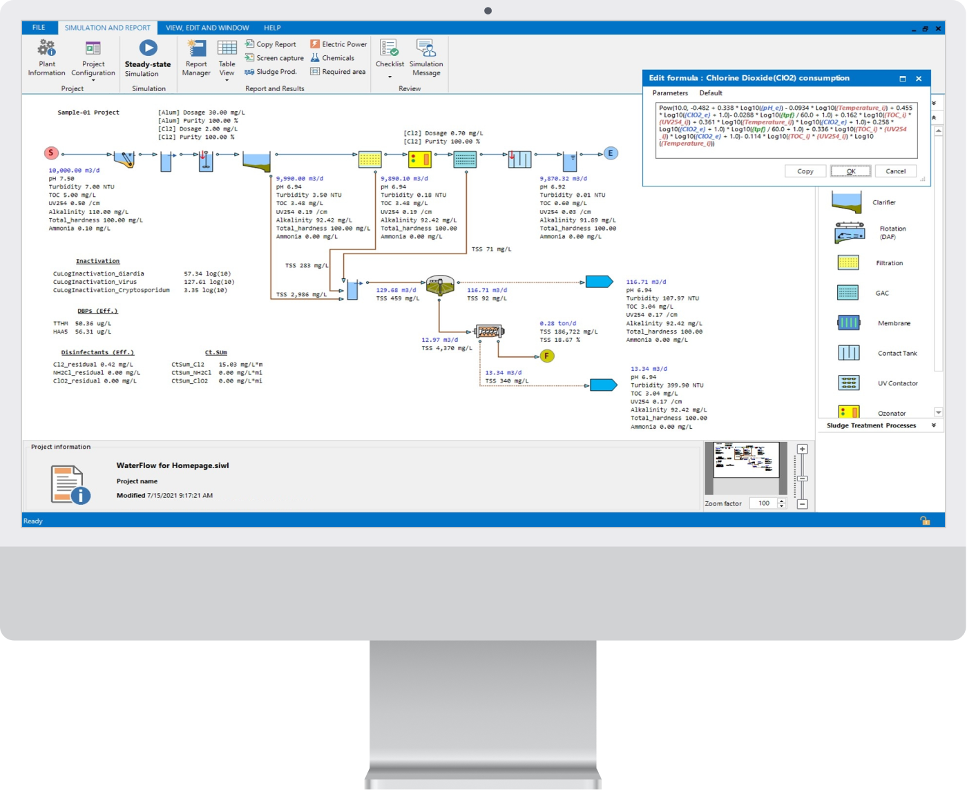 WaterFlow는 US EPA WTP 1.2 모델을 기반으로 유기물질 및 pH, 알칼리도 등 45개 이상의 다양한 수질 항목들을 시뮬레이션 합니다. US EPA WTP 모델은 콜로라도 대학교의 음용수 최적화 연구소가 미국 환경청(USEPA)을 위해 개발한 모델입니다.